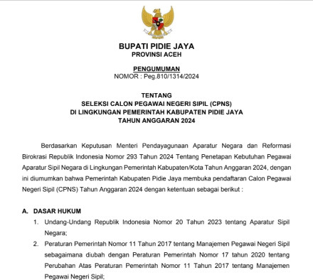 CPNS Resmi Dibuka, Berikut Formasi CPNS 2024 di Kabupaten Pidie Jaya